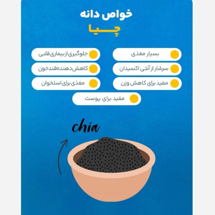 دانههای ریز چیا سرشار از فیبر، پروتئین، اسیدهای چرب امگا 3 و آنتیاکسیدان هستند و میتوانید آن را به بسیاری از غذاها اضافه کنید.